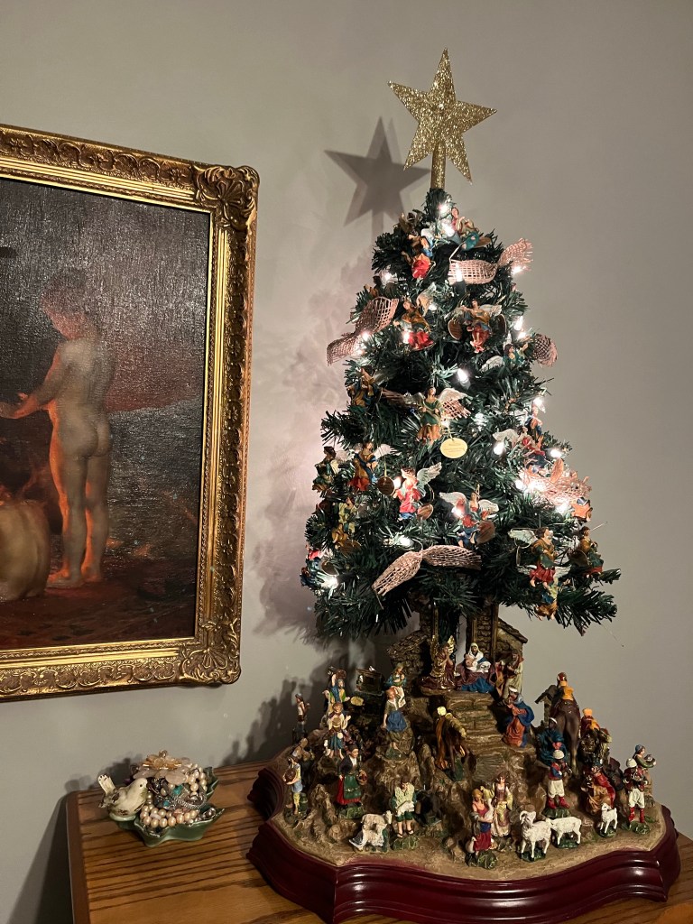In our bedroom, a small tree sits on a base that is ceramic representation of Bethlehem. The city scene centers on the nativity. There are dozens of ceramic figures going about their daily lives without seeming to notice the figures in the manger. People drawing water, fishing, tending crops and livestock. The tree itself is full of ceramic angels, proclaiming peace and joy. The tree also plays a haunting violin solo, “Silent night” at the push of the button. It is not a tree I would ever buy, even if it does have a collectible certificate of authenticity. It belonged to my uncle, who gave it to my mother and now somehow, it belongs to me. I sometimes look at that tree before I go to bed and wonder if, like to people in the diorama, I would have been so busy that I would have missed the world’s greatest gift. I wonder if that is true of me now. That in the rush to get things done, I miss the many blessings set before me. I pray to be more present and thankful.