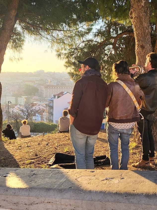 Good news! A tram is in sight. I try to enter only to discover that the driver is on his break. He points to the other side of the square where the tram line is already 30 people deep. We walk to the line. It is a sea of people with multiple bus and tram stops. We are overwhelmed. Gps says we can walk to Graca in 15 minutes. Since we need to buy groceries in Graca we decide to head off. After a few blocks we come to an outdoor escalator up the hill. Yay! This won’t be bad after all. After a few more blocks we see a giant hill. Sigh! We can do this. We huff and puff our way to the Jardim da Cerca da Graca. Beautiful views on a beautiful terrace. I am enchanted and explore the park. Meanwhile my husband and travel partner has been assessing our location and correctly assumes that we are only halfway up the hill. He begins to protest, but there is no remedy but climbing on . . . So up we go to Graca. At the miradouro dos barrow (a miradouro is a scenic overlook) we find young musicians playing fado (Portuguese blues) in the park. It is wonderful and haunting. We collapse against a wall and listen as the sun sets. Some climbs are worth it.