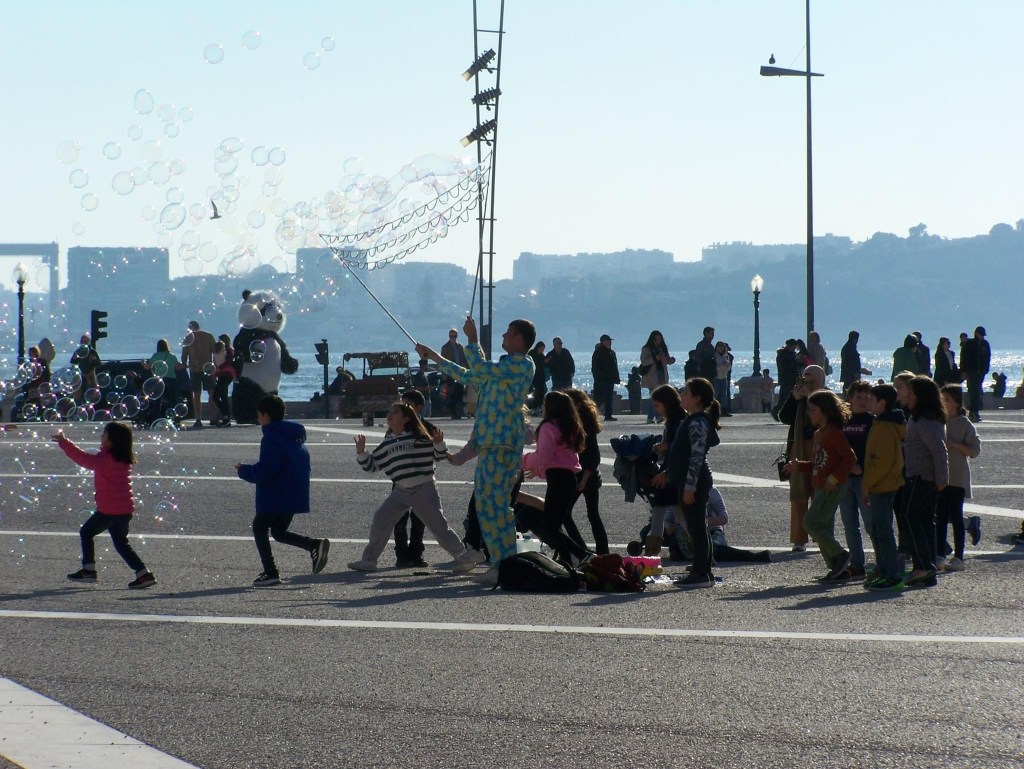 The sheer size of the Praco de Comercio is overwhelming. What used to be the center of government is now a meeting place in the city. Tourists take photos. A giant dancing panda and a man with a bubble machine entertain children. Police mingle with youth mildly protesting something, although I can’t figure out their cause. We wander the square and find a cafe for lunch.