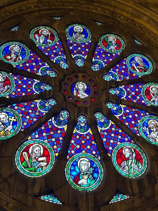 At the top of the stairs we are able to visit an outdoor balcony (where a bishop was tossed to his death for supposedly colluding with Spain). Once inside we encounter a spectacular rose window. Jesus and the apostles glimmer in brightly colored glass. We also get an aerial view of the interior of the church in all its glory.