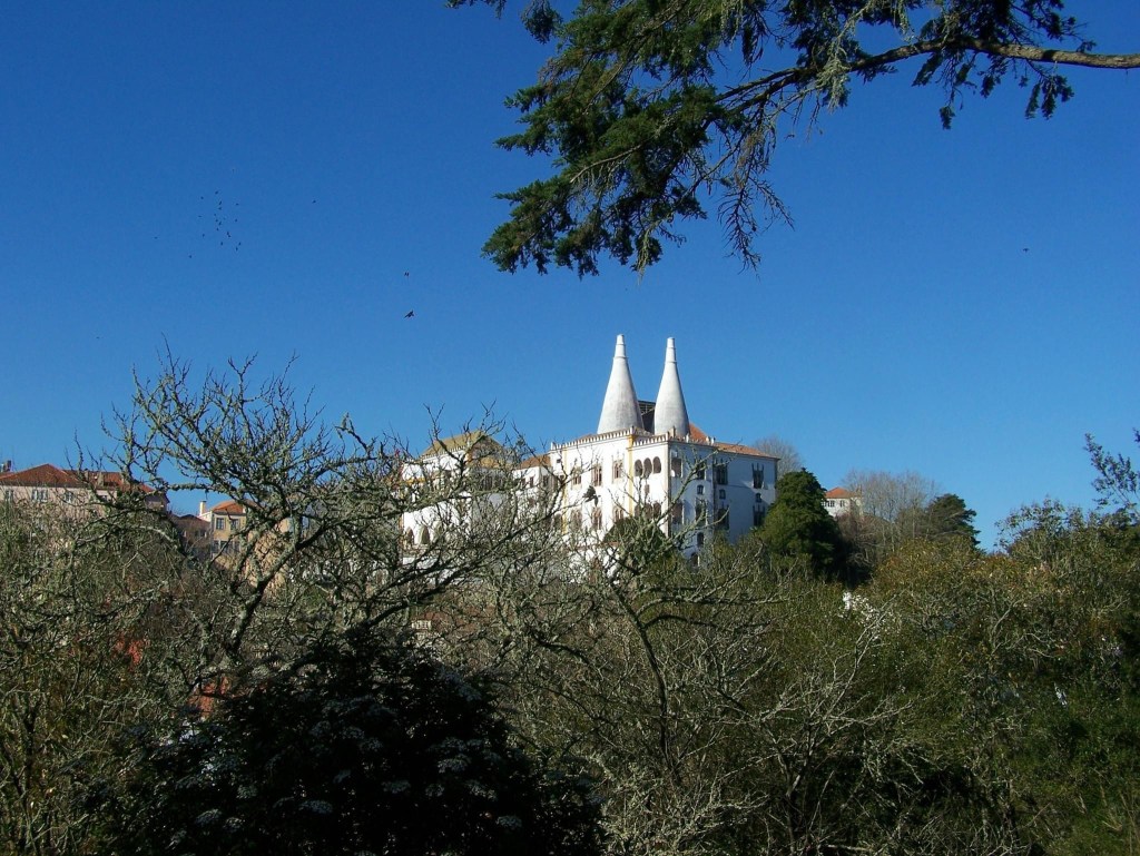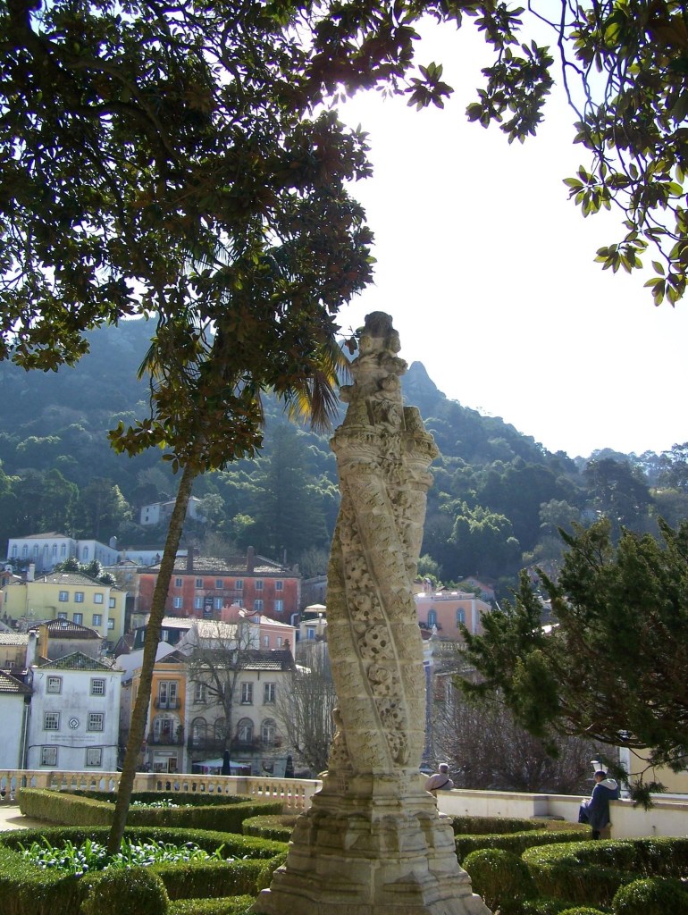 It is a barrage of tuk tuks and tourism office representatives at the train station gates. We are overwhelmed by picture cards shoved in our faces. We try to walk away as quickly as we can, but we need information. I ask a man how to get to the national palace. He says left and then follow the road to the right. We follow the road but I can see the national palace (it’s smokestacks are unmistakable) on the right. It is tempting to go right. Bu the tourist office man said to turn left, so we turn left. On the road We pass a man dancing and yelling “Carnivale”. He is having a great time but seems a little crazy. We cross the street and hope we are not lost. We climb another steep hill and wander around the hillside some more. We are good at wandering around. A castle peaks out further up the mountain. Palatial homes dot the hillsides along with statues and Moorish architecture. I find a throne to sit on among the pieces of public art that line the roadway.