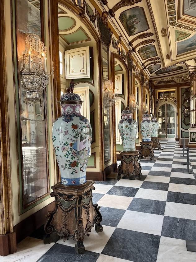 The throne room is testament to colonial conquest. Oriental vases, parquet floors, and murals representing the colonial empire fit together in an impressive display of power and elegance. I imagine a ball in this room with the king and queen enthroned on one end of the room and the infantas enthroned at the other.