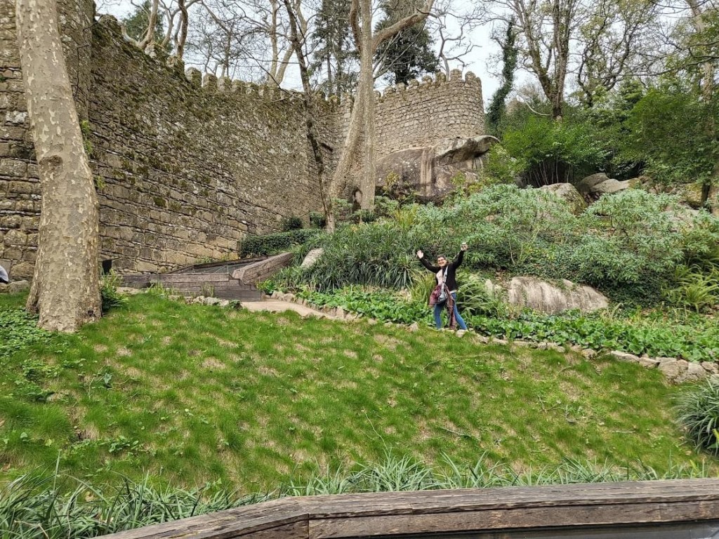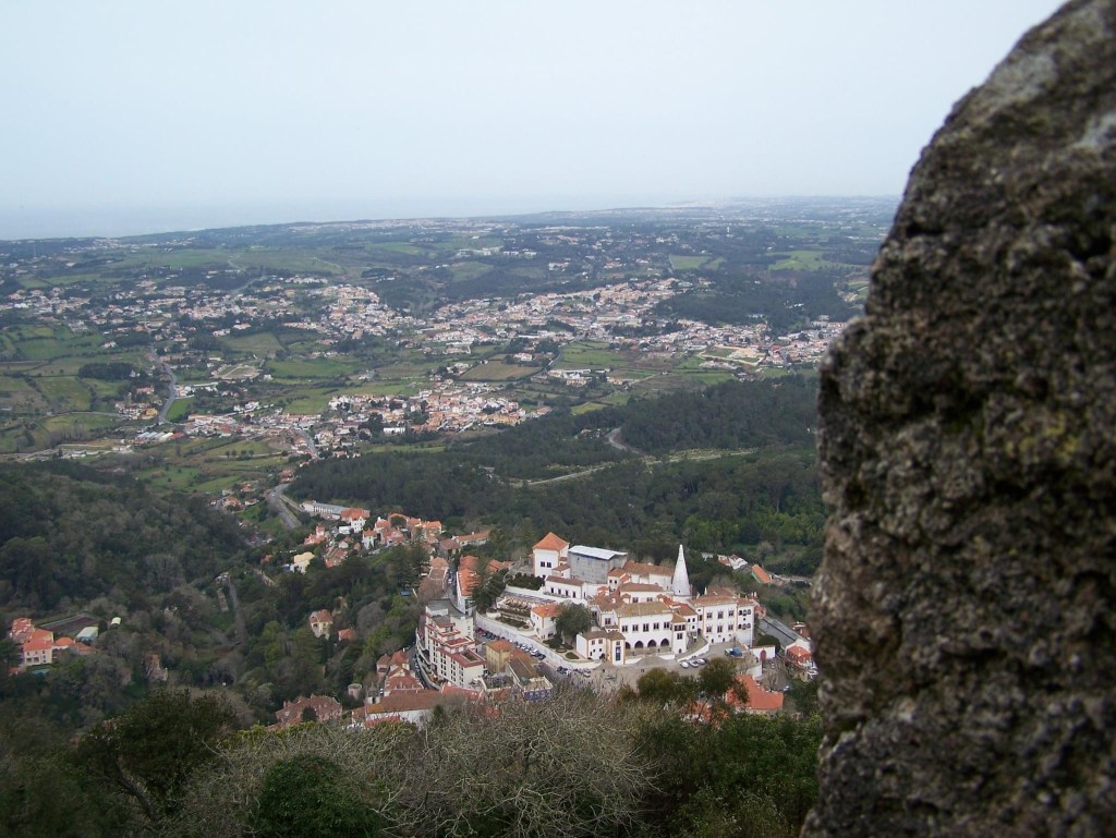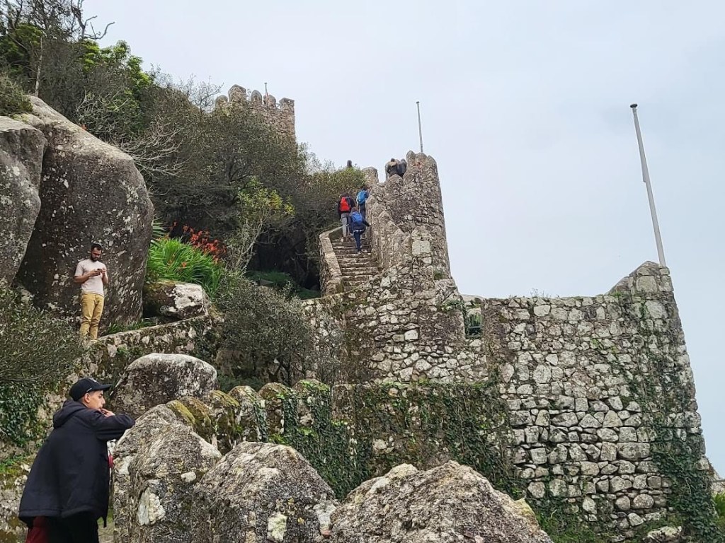 I chose the castles walls. The wall walk was beautiful and invigorating. Looking down at the winding streets of Sintra, I am glad we took the tuk tuk. (We may have died before reaching the mountain top and certainly couldn’t have done this walk afterwards.) Each step along the walls took me higher. There were no guard rails or handrails. The wall was low in spots and the stairs seemed narrower the higher I climbed. Because the wall was built along a cliff face, it was a long way to the ground. Definitely it a walk for the faint of heart or the unfit. But the views…. The views….. The National Palace of Sintra, visited on a prior trip, was visible in the distance. I drank in the country side and the glimpses of the sea.