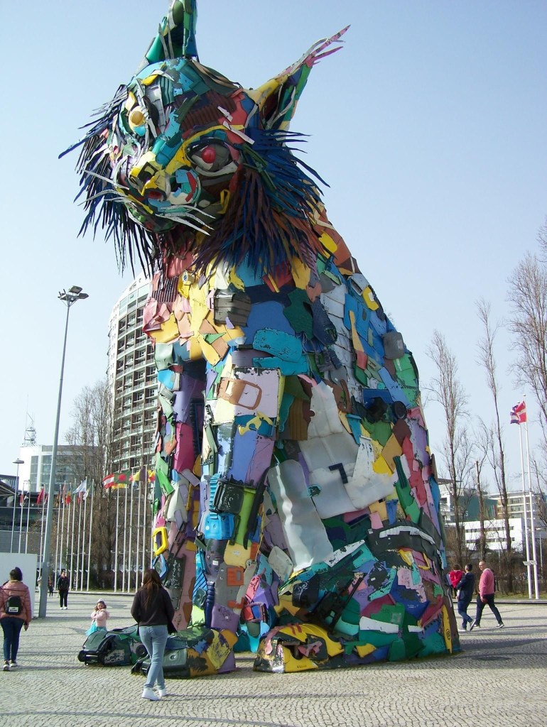 After all that meat, I needed to walk a bit. So I strolled the park’s central avenue and took pictures of statues. My favorite was a giant cat sculpture made entirely of plastic trash retrieved from the ocean. The Portuguese have a special relationship with the sea, so I was delighted to see something so beautiful reclaimed from garbage previously polluting the ocean. It was a playful statue and a real attention getter in the center of the park.