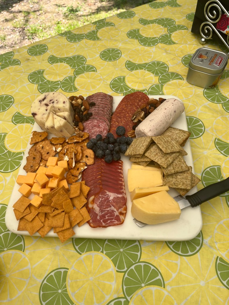 I channel my ancestors and cook in cast iron over the open flames. Biscuits and bacon is the preferred breakfast. Nothing can beat campfire coffee on a chilly morning. Dinner can be chili or bbq and a hot cherry cobbler. Sometimes we make steak smothered in butter and garlic over the fire. If you ask me, everything tastes better cooked over the flames. However, if the day is busy, simple fare such as cheese and berries can also be delightful. We take the time to savor.