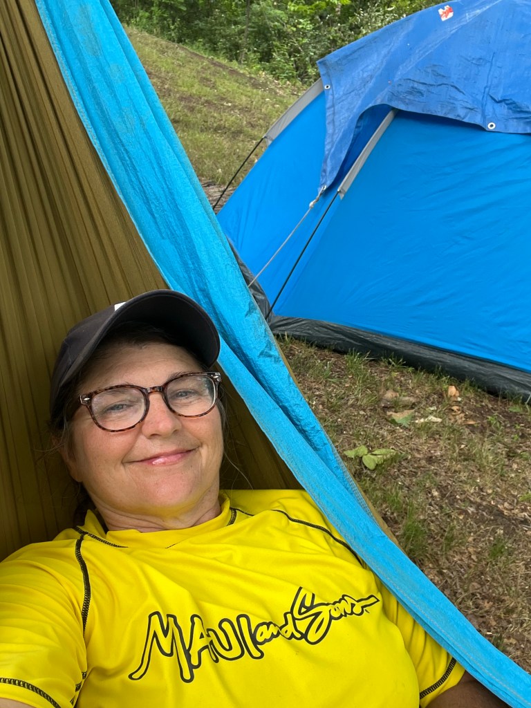 She arrived first and began scouting a campsite. 1000 Hills state park got its name for a reason. Finding any level ground to pitch a tent was a challenge. It had been very dry and so it was hard to get stakes in the ground. I pitched my tent closer to the woods in order to give her the more level and higher ground.