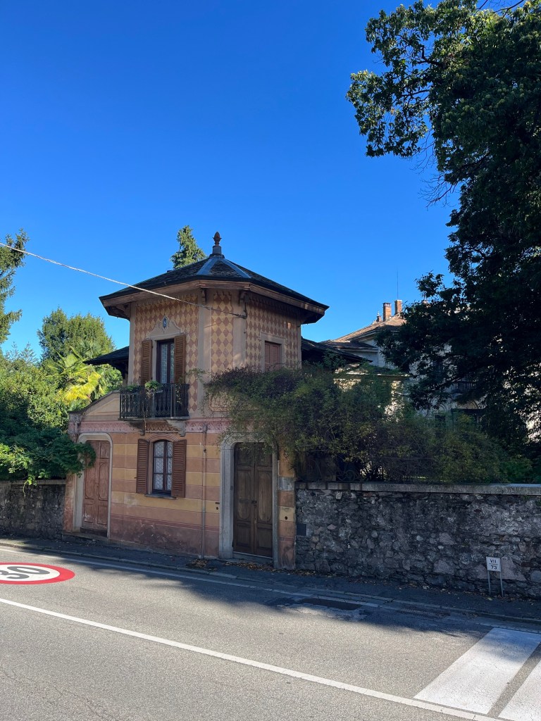 At end of day, we explored Lesa, the little town we call home for the next several weeks. The town is small, only a few streets wide. The structures are ancient and I could easily be strolling 1000’s era Italy. If it weren’t for an occasional electric line, I would never know I was in the 20th century. Main Street along the lake is more modern and is a restaurant row. Having just had lunch, we opt for gelato. Peach for me, made from fresh puréed peach. My husband gets some unholy combinations of chocolate, stracciatella, and strawberry. And we sit with our gelato treasure and watch the boats in the little harbor.