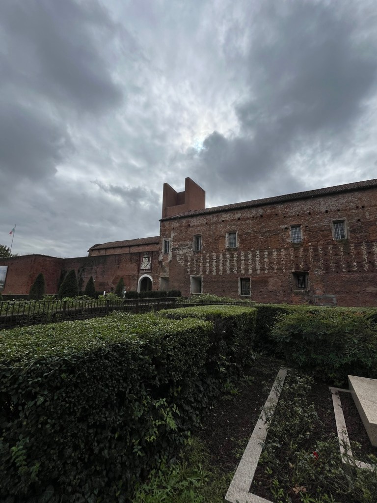 Ironically, the street we use to walk into the old city goes past the very first lot we tried. We venture through the lovely Parco Bambin toward the Castello Sforzesco. It is not open for tours so we take some photos and move into the Piazza Martiri Della Liberty across the street. The plaza sadly, is now a parking lot with a lovely statue. But we don’t want to be run over by parking obsessed drivers, so we move along. The competition for a space is intense…..even for Italy.