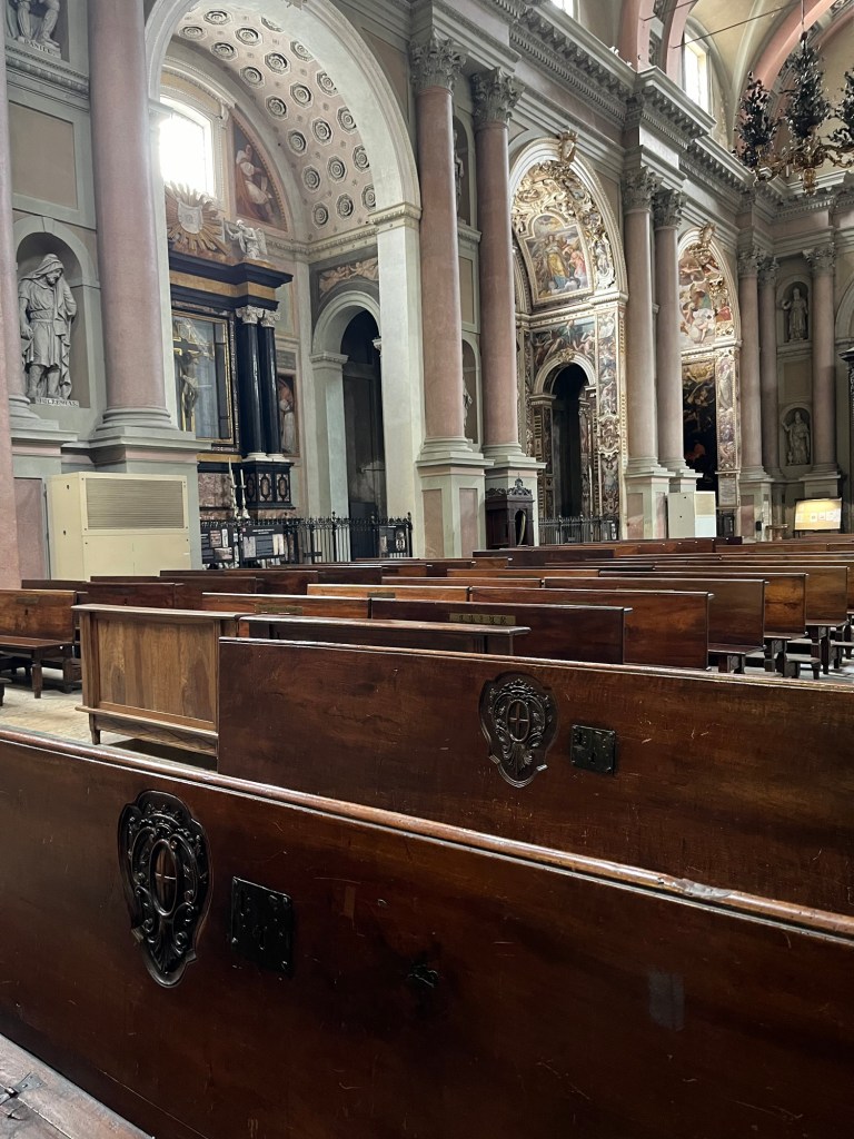 Before lunch, I wanted to see the cathedral of Santa Maria Assunta. We walked in the direction of the bell tower. We reached a beautiful street of endless colonnades. But the church courtyard was locked with large iron gates. A sign on the church door said entrance but there was no visible no way in. I double checked the schedule which assured me the church was open…except it wasn’t.