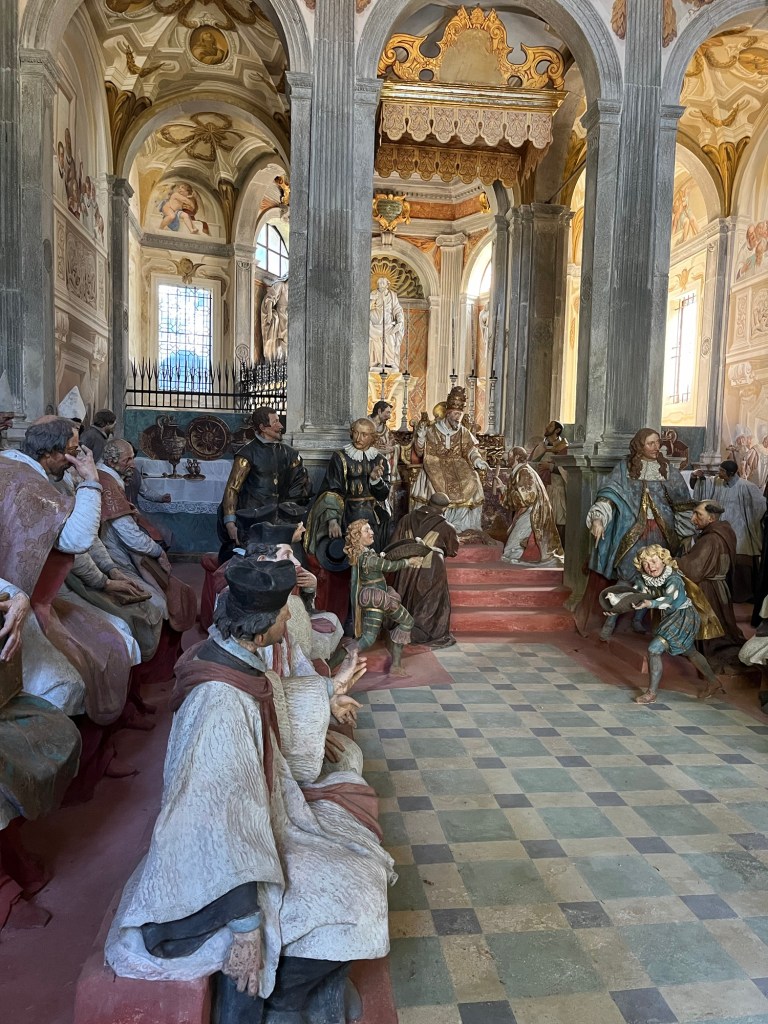 I was on my own to explore the Sacro Monte di Orta. The twenty or so chapels were unlike anything I had ever seen. Intricate, painted terra cotta sculptures were set up like elaborate life size doll houses. Some chapels were well kept and illuminated, some were dark and in decline.Each held surprises. A chariot of fire. A women breastfeeding a child. Soldiers. Children at play. All carefully crafted and brightly painted.