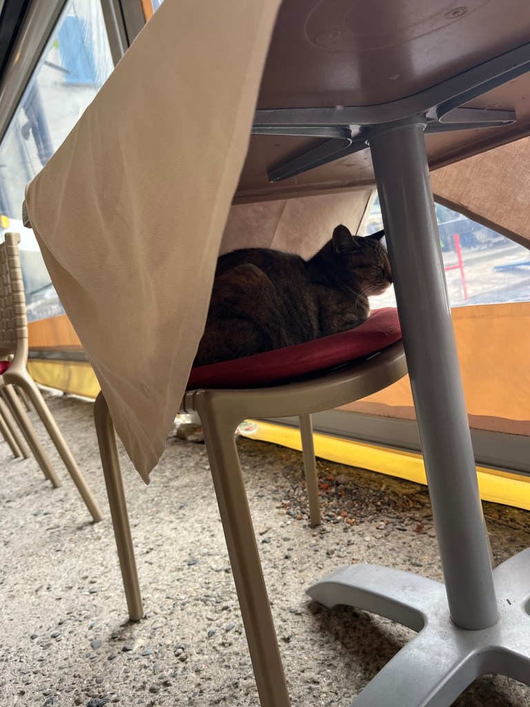 Luckily, we were seated. I must have looked desperate. We weren’t even the last ones to arrive late and slightly wet from the rain. Thanks to the hostess, we had a great meal on a dock overlooking a beautiful lake. There were space heaters and tiramisu. My day was looking up. Sometimes it is all about managing your expectations and enjoying where you are. A cat joined us at the table, lounging in an empty chair and trying to share our meal. He understood that sometimes you have to make your own fun.