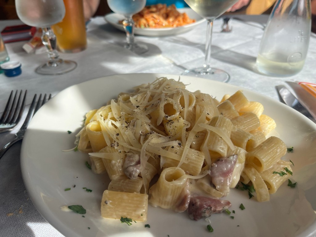 The only others in the restaurant are local workers, anxiously monitoring the helicopter out the window. The rain comes down steadily, so we settle in to enjoy our midday meal. I order the local Macagnughese pasta. It is unquestionably the best pasta I have ever had. It doesn’t look special, but the combination of locally cured bacon, locally made cheese, potatoes, onions, and seasoning is fantastic.