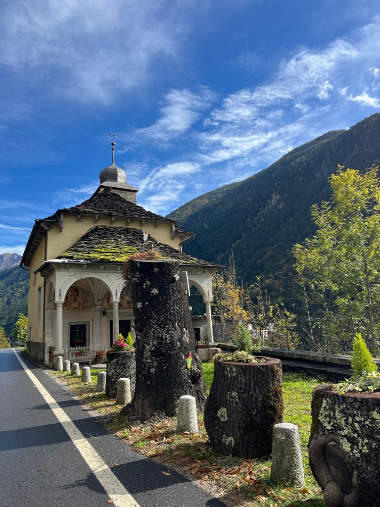 Reluctantly we have to leave our foodie oasis. The rain has stopped so walk through the trees. I appreciate the autumn color. Satisfied, we drive back into the village and reset our parking clock in order to visit the ornate church on the far side of the town. A beautiful church in a mountain village with cows grazing nearby, provides a bucolic setting.