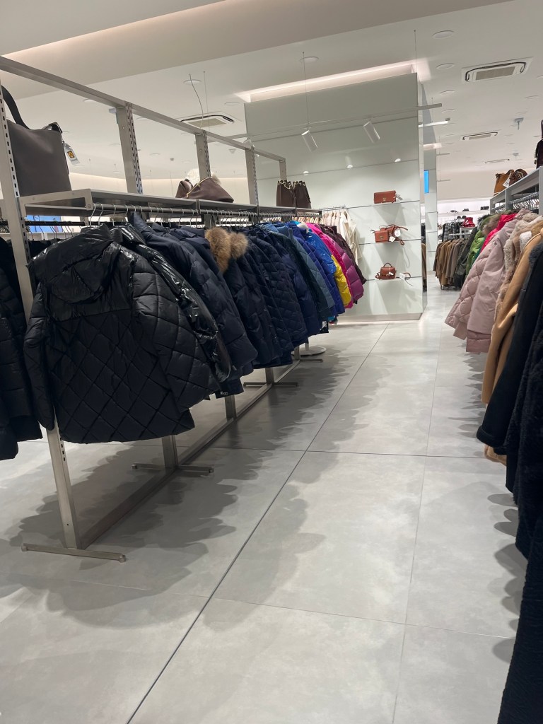 Women’s fashion was more diverse. Entire stores of plain cashmere sweaters in every color of the rainbow dotted the mall. The next shop held only coats. The next had high fashion evening gowns and silk suits. A few stores had mid-season collection sales. Many items, like a baby blue silk suit with ostrich feathers down the back of each sleeve, were entirely and fantastically impractical. But eventually, I found my store ….full of fine things that a midwestern girl could wear with a little spring in her step.