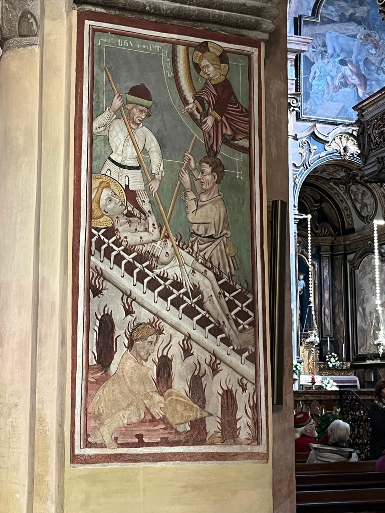 After I had a wonderful lunch of saffron and truffle pasta, we boarded a boat to the basilica. The ancient structure is amazing. The frescoes could have been painted yesterday instead of centuries ago. There were far fewer people this time and we were able to linger over paintings of the saints. I fell deeper in love with Orta San Giulio.