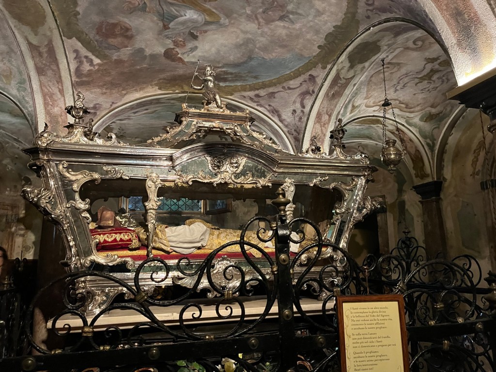 In the crypt, the body of Saint Guilio layed where he has been for centuries in his glass coffin. The dark crypt was illuminated by dozens of candles and a brightly painted ceiling, but it was still a little creepy. It was also peaceful. You feel connected in time to an ancient tradition of faith.