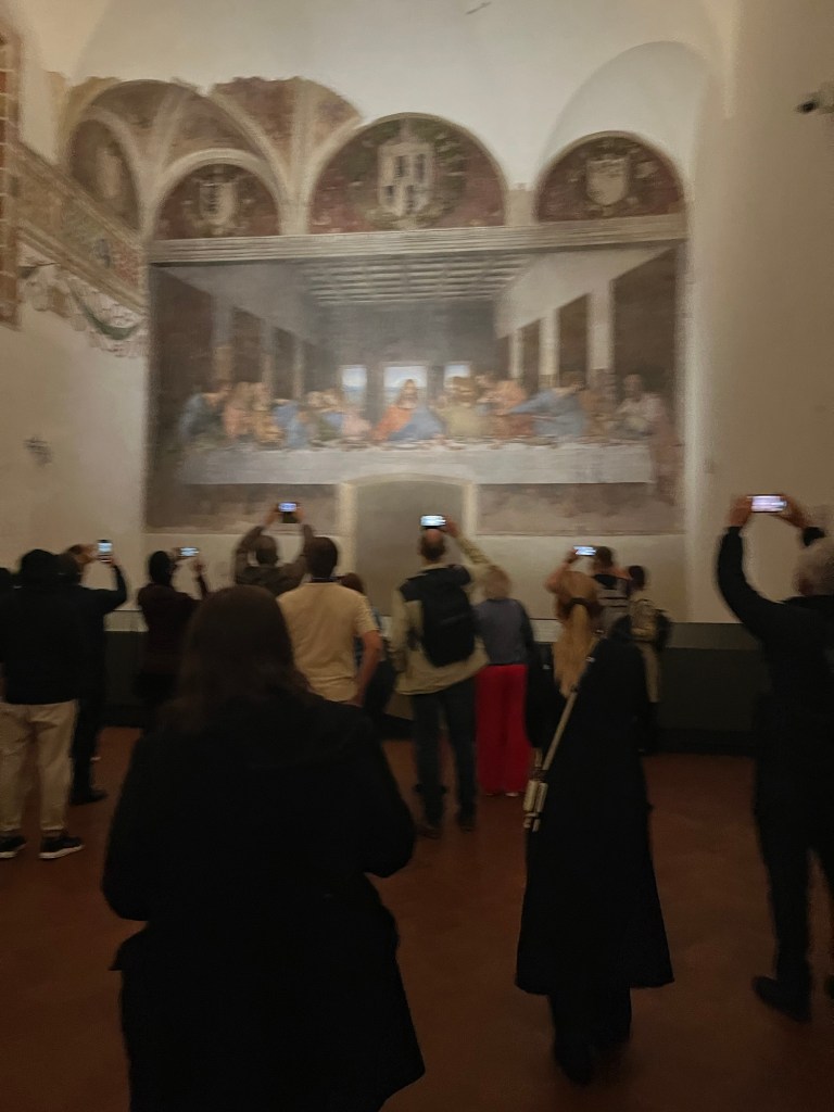 Entering required showing id, getting a personalized ticket, and waiting in line to go through timed air-locked doors. When it was our turn we entered the dining room of the monastery. The Last Supper was painted on the wall of the dining room opposite the kitchen. The heat from the kitchen did a lot of damage over the years. At one point the monks chopped off the bottom of the painting (and Jesus’s feet) to enlarge the kitchen door. Seems ridiculous to us, but apparently someone was tired of ducking under the doorway.