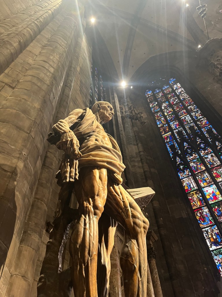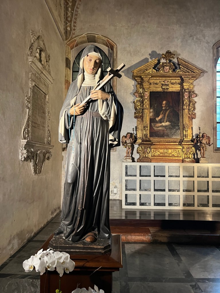 We heard how St. Charles, (Carlo Borromeo) carried a nail from the true cross through the streets of Milan to combat the plague. The nail is now keep high above the altar and is only brought down once a year in an elaborate ceremony . She told us about Andrea Bocelli singing alone in the Duomo during Covid while the nail was lowered as a symbol of hope. I watched the televised concert but did not understand the symbolism as it was happening. I wish I would have known.
