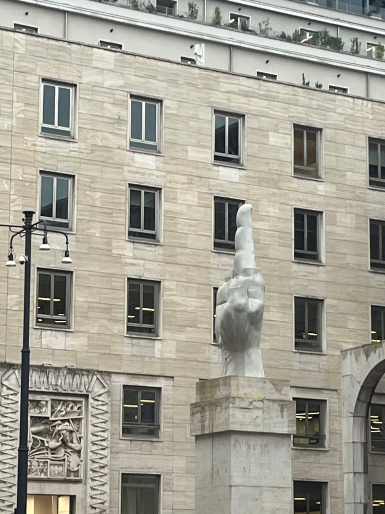 Outside the stock exchange, there was a marble statue of a raised middle finger. Apparently the Milanese are still upset about the severe economic downturn and stock market losses of the early 2000’s and have enough of a sense of humor to make public, their private sentiments. At this point, she also told us that the statue somehow was related to the civil war between the facists and the monarchists during WWII. I didn’t catch the connection. But Italy is still trying to recover from there brush with fascism.