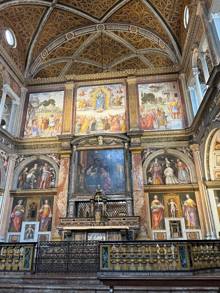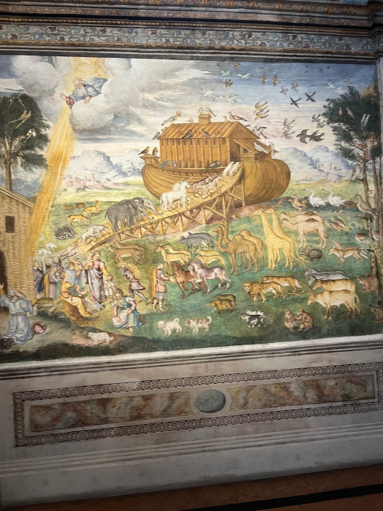 The chapel was a riot of paintings of the saints. I didn’t know where to look as each surface was covered in pristine fresco . However the magic happened behind the chapel in the nuns walk. An intricate choir was surrounded by frescoes from 1200 to 1500. Noah’s ark, Adam and Eve, and numerous other biblical scenes played out in technicolor. The colors and themes were unique for their time period and each expertly done. It was a true visual delight.