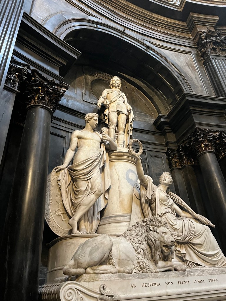 After the palace rooms, we visited the chapel Reale, which housed the shroud of Turin on its altar until the 1970’s. The round marble chapel was magnificent with a golden sunburst altarpiece. In each alcove of the round chapel, a giant marble statue marked a grave. The chapel opened onto the larger church of the Duomo di San Giovanni. Parishioners could have looked upward into the chapel toward the holy shroud.