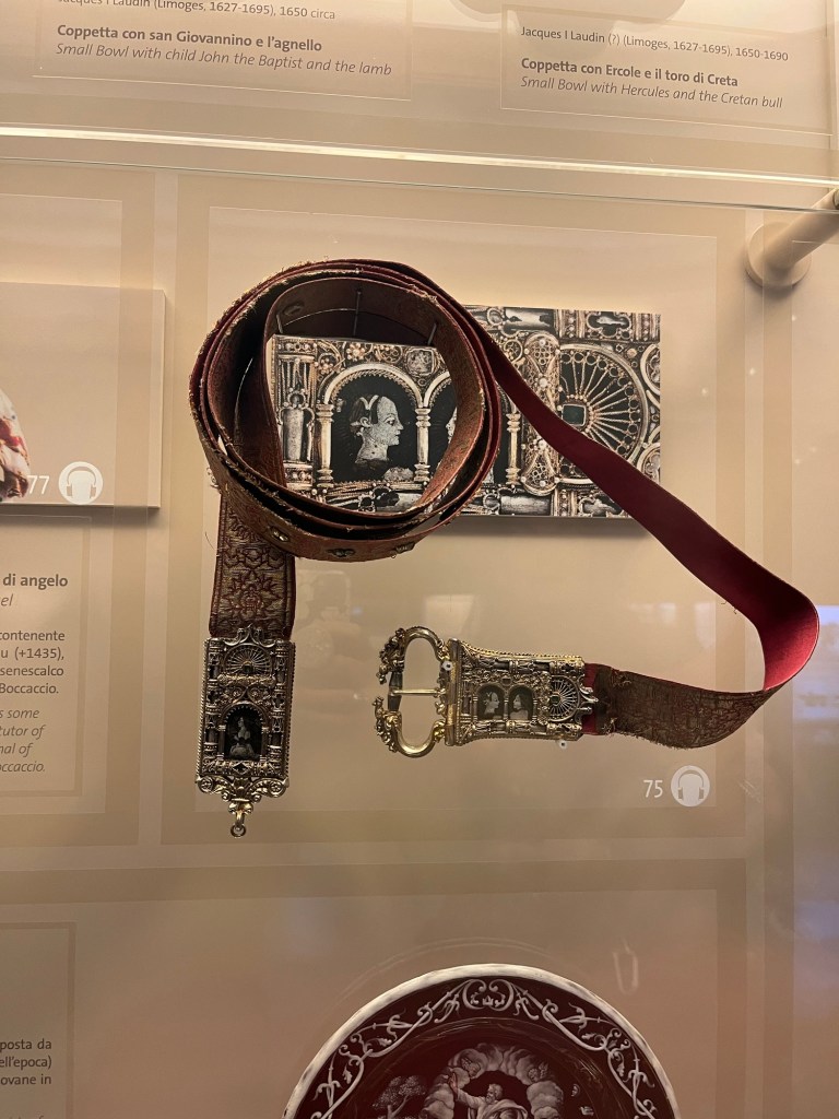 I don’t know how it is possible to make such an accurate likeness in such a small surface. The best piece was a belt in which the bridal portraits were embedded in the buckle.