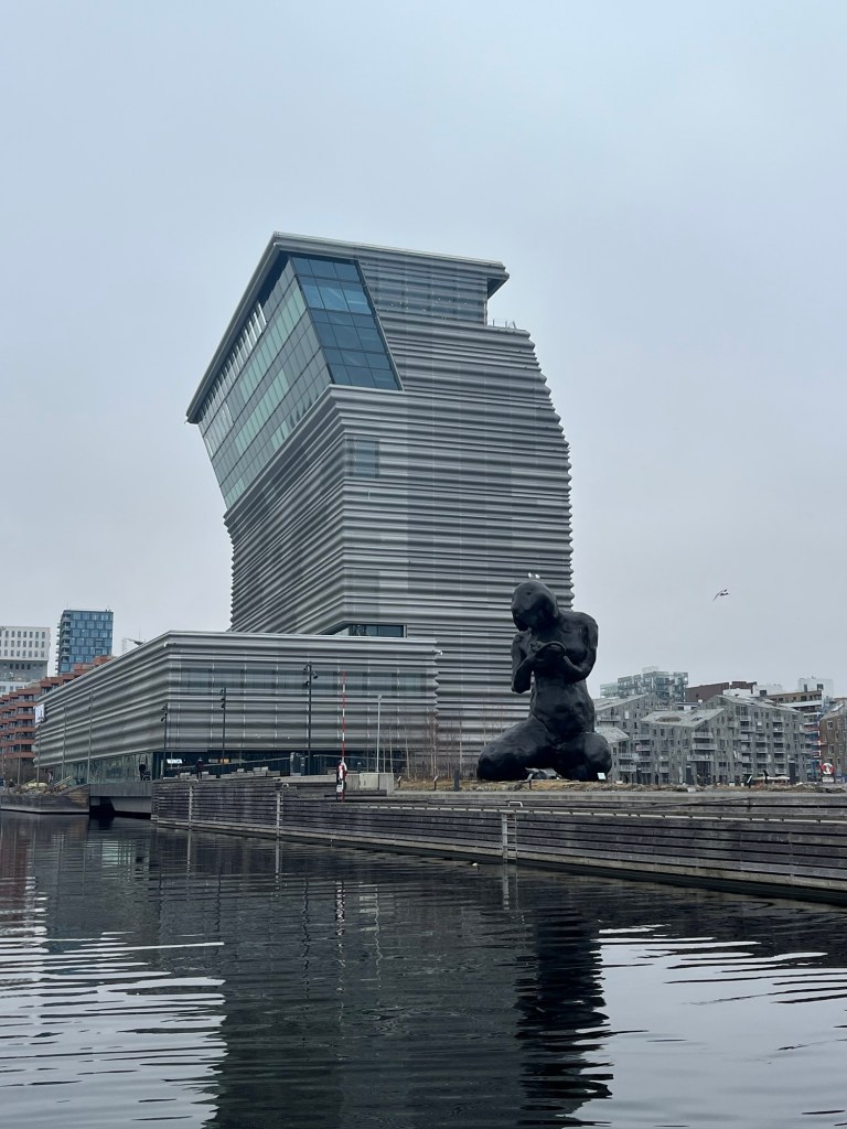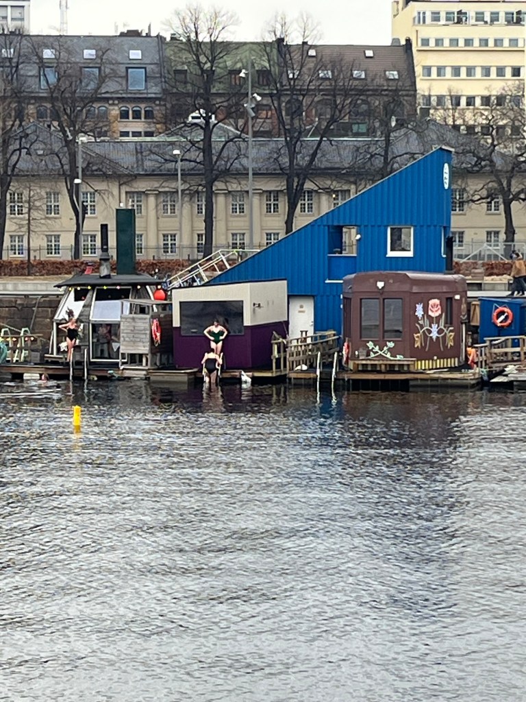 Statues and playgrounds line the water. A pop up art gallery in the sand intrigues me. Families run, jump and play. People eat outside and gather in the parks even thought the temperature is in the 30’s. Even more surprising are the dozens of people enjoying the floating saunas and swimming in the frigid fjord. The outdoor and water temperature is hovering in the low 30’s and I am freezing on their behalf.