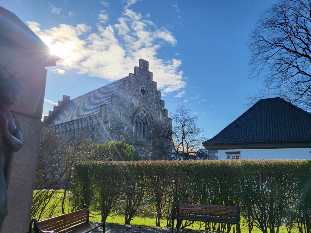 Deep in thought, I survive the steep circular descent and emerge into the Bergenhus Festning (Fortress). It is a strange mix of military base and public park. Home of the Norwegian Music corps and medieval castles. The walk is lovely and I am intrigued by large crow like birds that dance across the grass. Also, I am surprised that we are walking through an active military base.