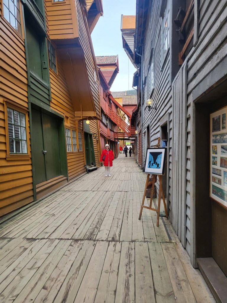 It is late afternoon and we need food. Meals are very expensive, so a quick lunch will have to do. I will cook a nice evening meal at the apartment. But first, we walk through Bryggen. The old wooden buildings are a protected world heritage site. From these shops the Hanseatic League engaged in world trade for over 400 years. The buildings are quirky, crooked, and densely packed. Today, shops and restaurants fill the buildings as commerce continues. Tourists buy woolens and fur. I am content to browse. . . My husband waits patiently and thinks about walking up that big hill to get to our apartment.