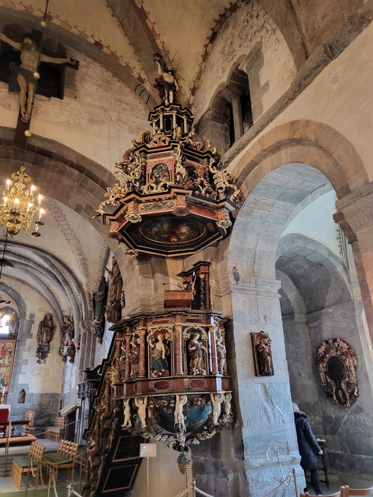 After the reminder of the terrible chaos power hungry men can inflict, we decide to go to church. St. Mary’s cathedral is one of the oldest churches in Norway. The pulpit is dazzling, carved and painted wood. It is a simple reminder that God supports the world and that we are all connected. I say a prayer for this country and ours. I pray for peace and liberty and justice for all.