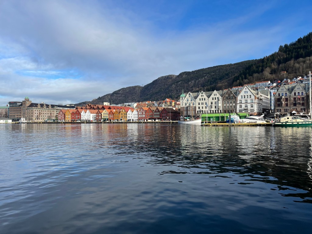 A great rule of travel is to expect the unexpected. This usually means to be prepared for things to go wrong. Some days, however, are unexpectedly full of delightful surprises. Today is one of those days. After sleeping much later than I intended, we take our time getting ready. A walk across town, gave me the perfect opportunity to photograph the Bryggen waterfront. The colorful buildings are beautiful when framed by water and sky.