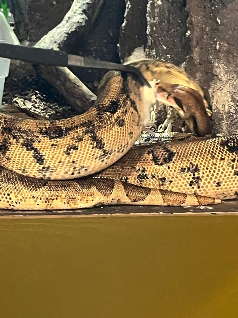 With enthusiasm, we are invited behind the scenes…since it is just the two of us in the entire complex. Wooden doors are opened into the display areas. Mice are placed on long metal poles. A monitor lizard with fierce jaws wrestles the mouse away almost faster than I can process and the. Runs away.