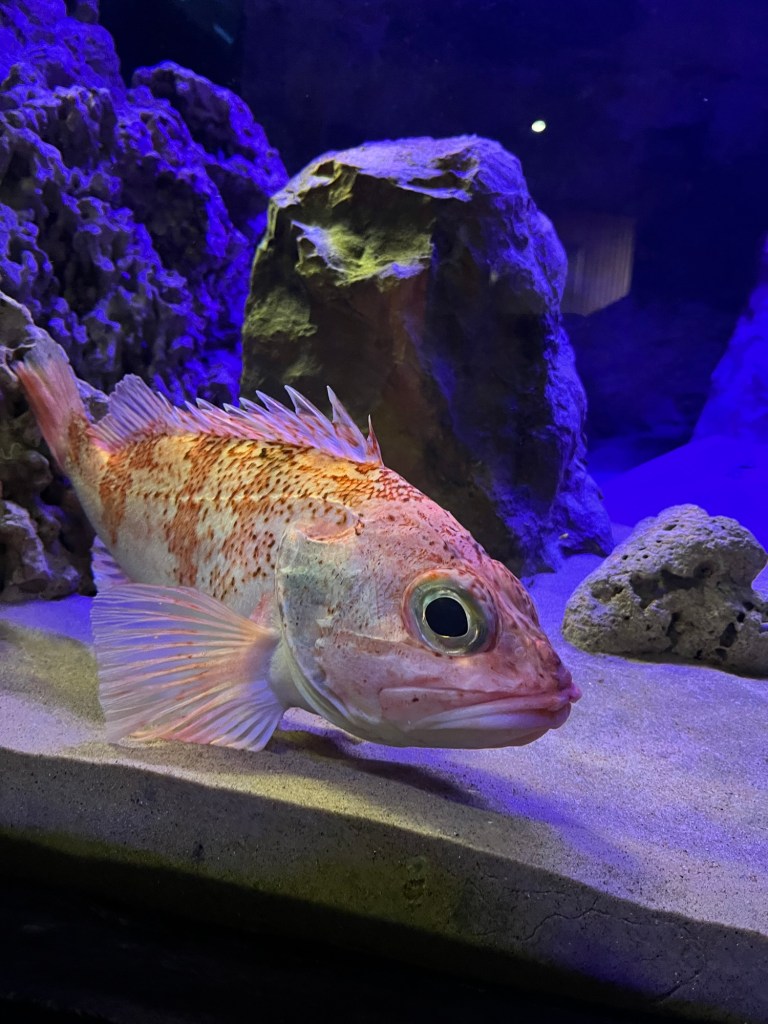 We decide to visit the aquarium. After wandering streets through high rise business. San Francisco style switchback streets, and a few parks along the water we arrive. We are the only visitors not accompanied by a small child, and there are several groups of preschoolers wearing yellow vests and chatting excitedly.