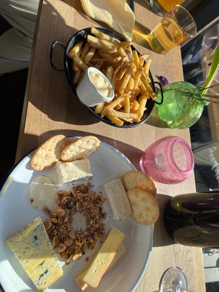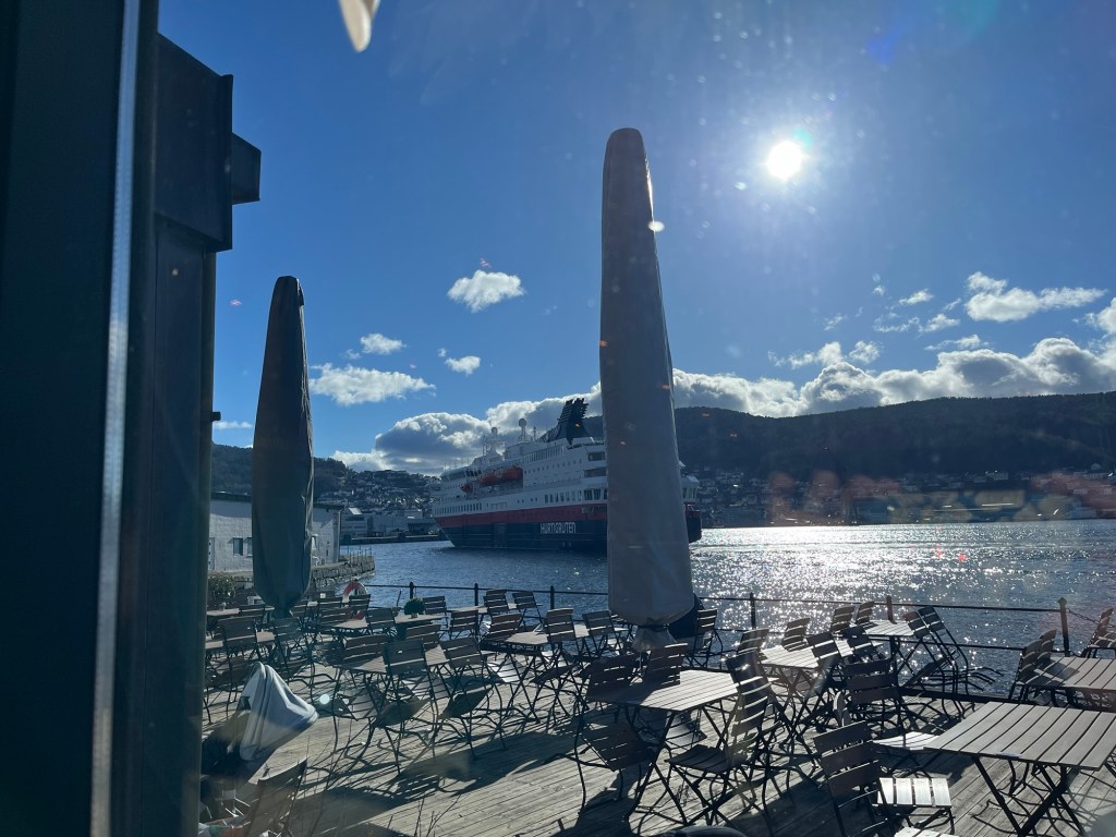 The view is good so we sit and examine the menu. We are the only people in the dining room (the locals all sit outside in the brisk 40 degree sunshine). At first, the offerings do not make sense to our American dining habits. Also, Norwegian food is expensive. Easily double what we would pay at home, I am having a hard time making my brain feel like it is worth the expense. Finally, we order fries and a cheese platter. A solid lunch we can share, but definitely nothing fancy.