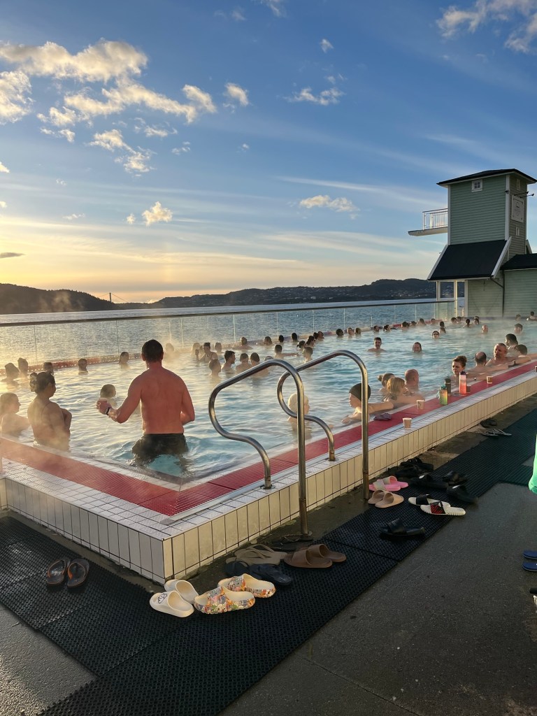 By late afternoon, we make our way back to the Nordnesparken. The historic city landmark has a heated pool, a sauna, and access to the sea. When in Norway…. You have to sauna and take the polar plunge. We wait in line with the locals on very narrow steep steps. Old men with speedos in mesh bags push past us. They apparently have annual passes and can’t be bothered with those of us who need to buy admission…Even if they have to knock us off of the steps to pass us. It is chaos.