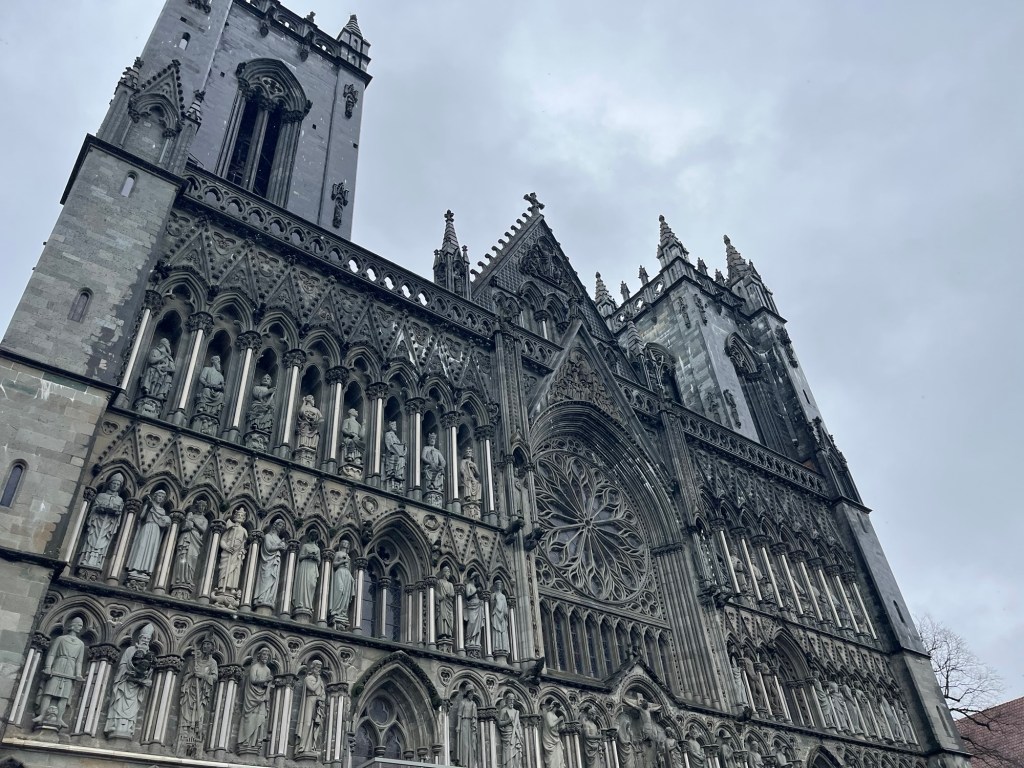 Once in town, the rain stops and the wind abates. I am finally able to appreciate the quaint buildings. Bright yellows, reds, and greens cover business facades. We pass larger government buildings done in neoclassical style, but we keep up a fast pace. We are in search of the Nidaros Cathedral, a Norwegian pilgrimage site, and we are on a tight schedule.