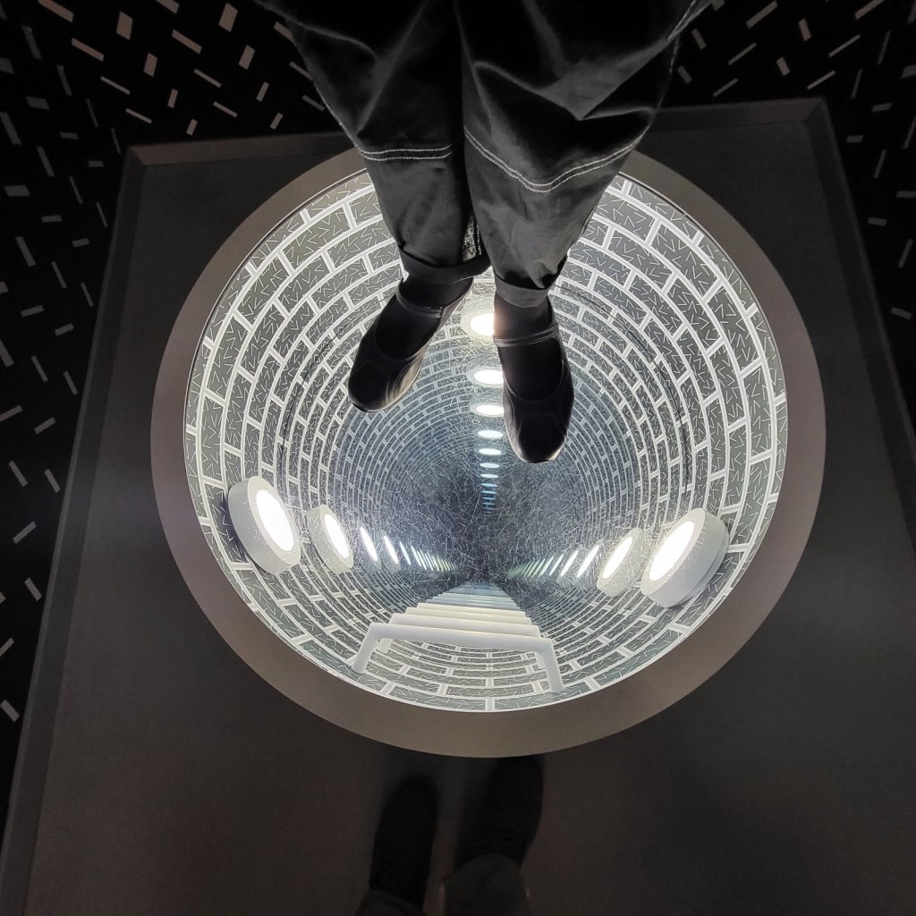 There are halls of mirrors, tables with floating heads, 3d pictures, camouflage walls, and a variety of mazes. We giggle and take a lot of pictures. I am a giant. I sit on a couch where my body looks separated from my feet. I stand on a bridge where the walls seem to spin around me. Big fun.