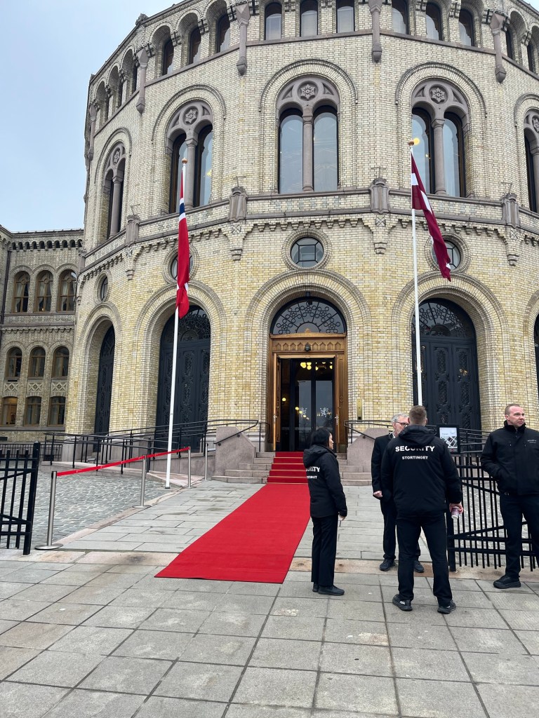 There are police cars lining the street between the Grand Hotel and the Stortering (Parliament) building. Officers line the street and politicians mill around outside . We gawk and walk among them. Oslo natives walk on by like it is a common occurrence.