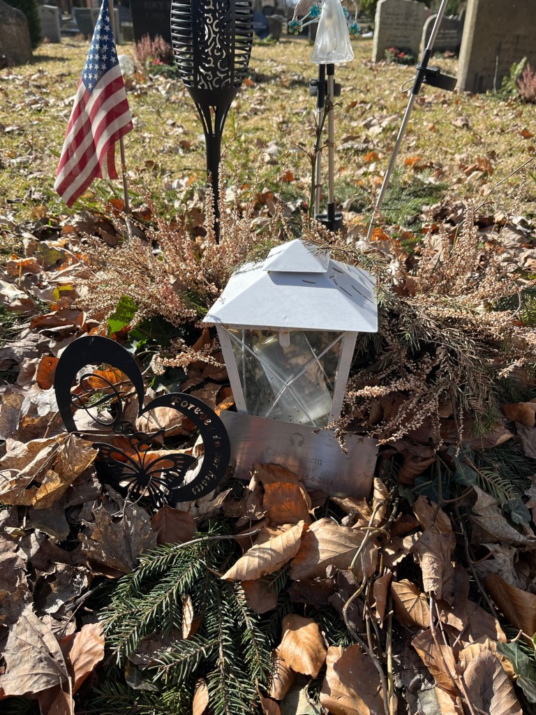 At the end of the park we find a lovely cemetery and decided to take a walk through. People are strolling in the park like setting. I stop to photograph the military monuments honoring those who died in World War II. Directly across the lane, we find a small, seemingly unmarked grave with American flags.