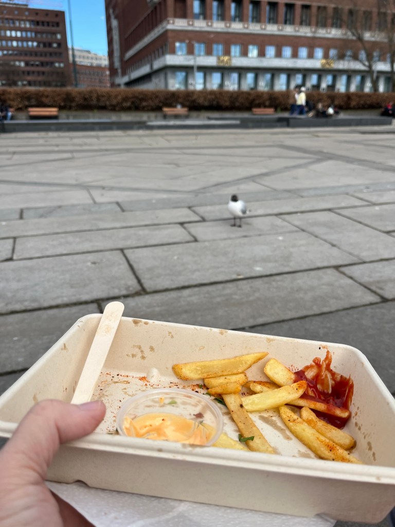 Once at the docks, I spot some food trucks. There are lots of fun options, but my guy loves fried chicken. So chicken it is. We split a large basket of chicken and fries. We decide to sit down to eat outside in the large plaza across from the city hall. The plaza is adorned by more Vigelund statues (naked people). It is also inhabited by many gulls who want our lunch. One persistent black and white demon sits and stares at my basket of fries. He chases all the other gulls away while crying “miiiiine”. The joke is on him. I don’t share food with wildlife.