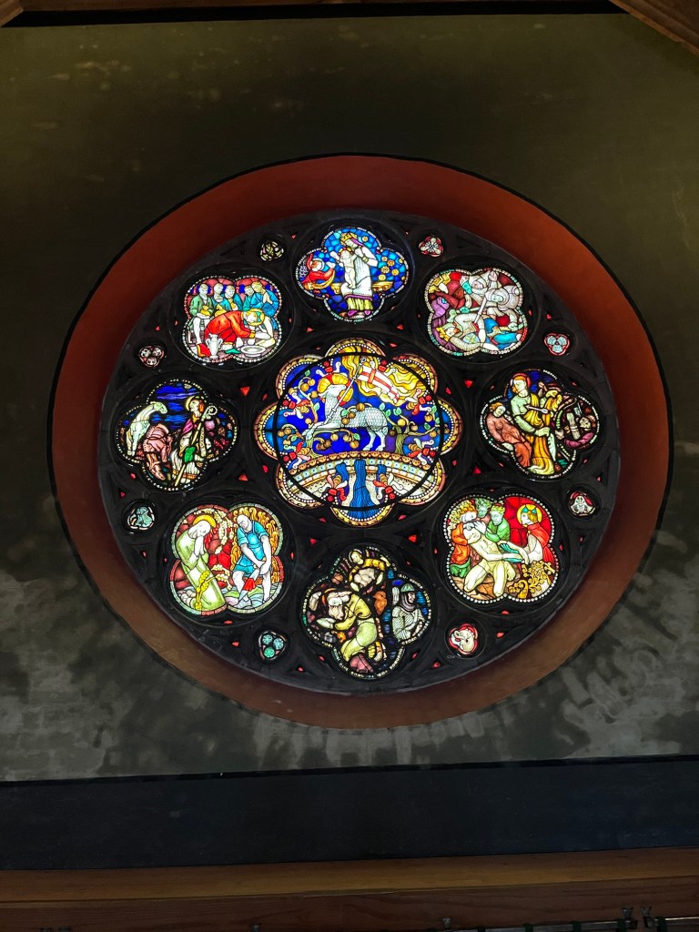In the final room, a beautiful stained glass masterpiece dominates a wall. The colors are radiant in an otherwise dark room. Sketches on the opposite end of the room show the construction and planning of the glass work. I am surprised to see the artist is Vigeland. So far all of the many pieces we have seen have been bronze statues of naked people. This is different and wonderful. Because it is a different Vigeland. Emmanuel not Gustav.