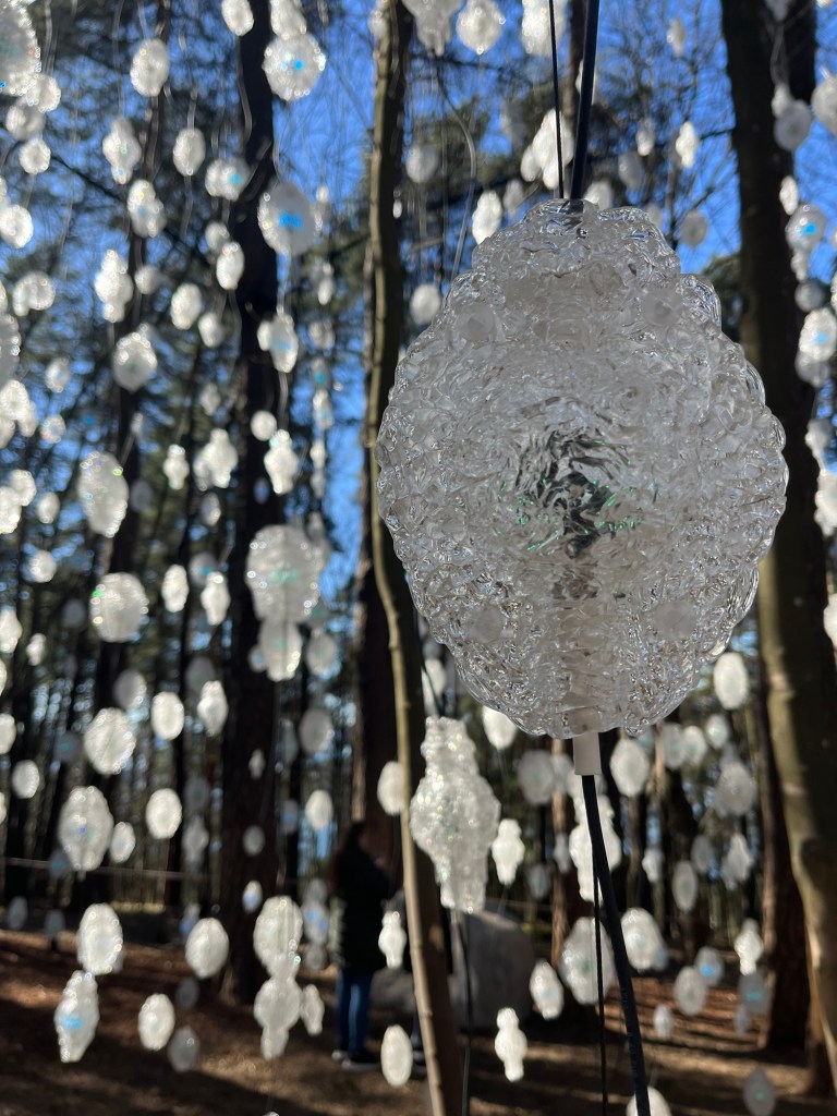 A leisurely walk down hill takes us past a snowflake forest full of colorful lights. Another grove of trees is lined with under wear. There are sculptures of tourists and whimsical mobiles. Towards the end of the walk, we stumble upon a statue of a woman defecating on communism. There are strange things in these woods.