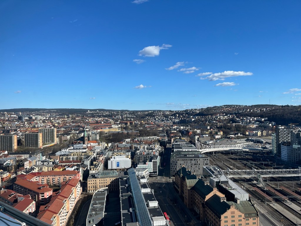 We end our day at the Radisson Blu Sky Bar. A window seat fifty stories high gives us great aerial views of Oslo. For the cost of an appetizer, we have the best seat in the house. Everyday should be a walk in the park. Today was that and more.