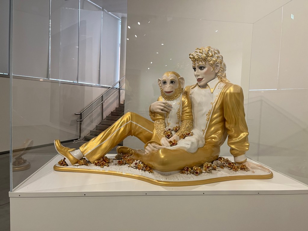 In the next gallery, a golden Michael Jackson sits with a monkey while a troll strolls the gallery with gum stuck to his foot. I don’t get it. Down the hall, an area with chairs all in a row sit in muted grey with artificial clouds hanging above. It reminds me of airlines and I begin to think about flight check in…and suddenly a large plastic door slides open (think sideways plane window shade). The inside is brightly lit and a large plush unicorn lays looking back at me. What on earth? Before I can react, the door closes. I have to get out of here….