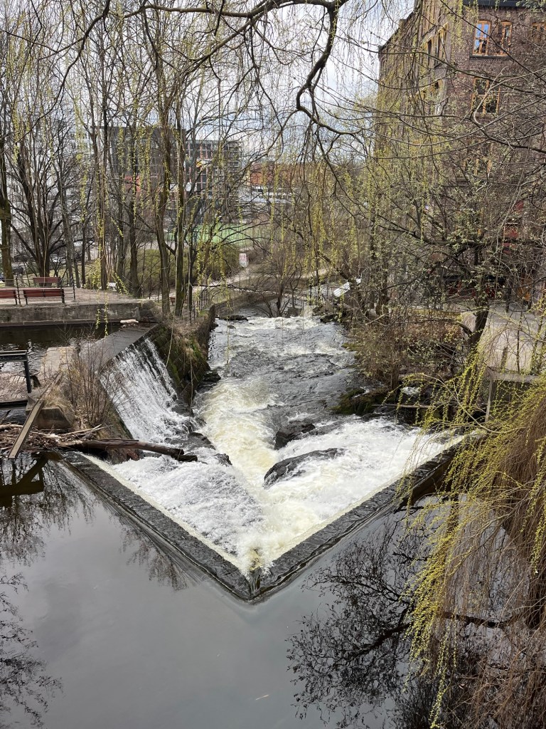 Outside, the weather has thankfully improved. I want to walk along the Akerselva one last time. The river runs along its course, by former factories now converted into shops, and over waterfalls. Not many people are out today so we walk easily along the paths. I won’t miss dodging electric scooters. But I will miss this ritual of afternoon walks through the neighborhood.