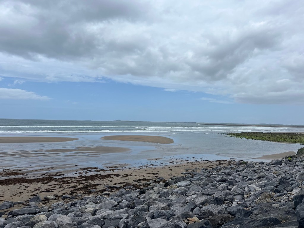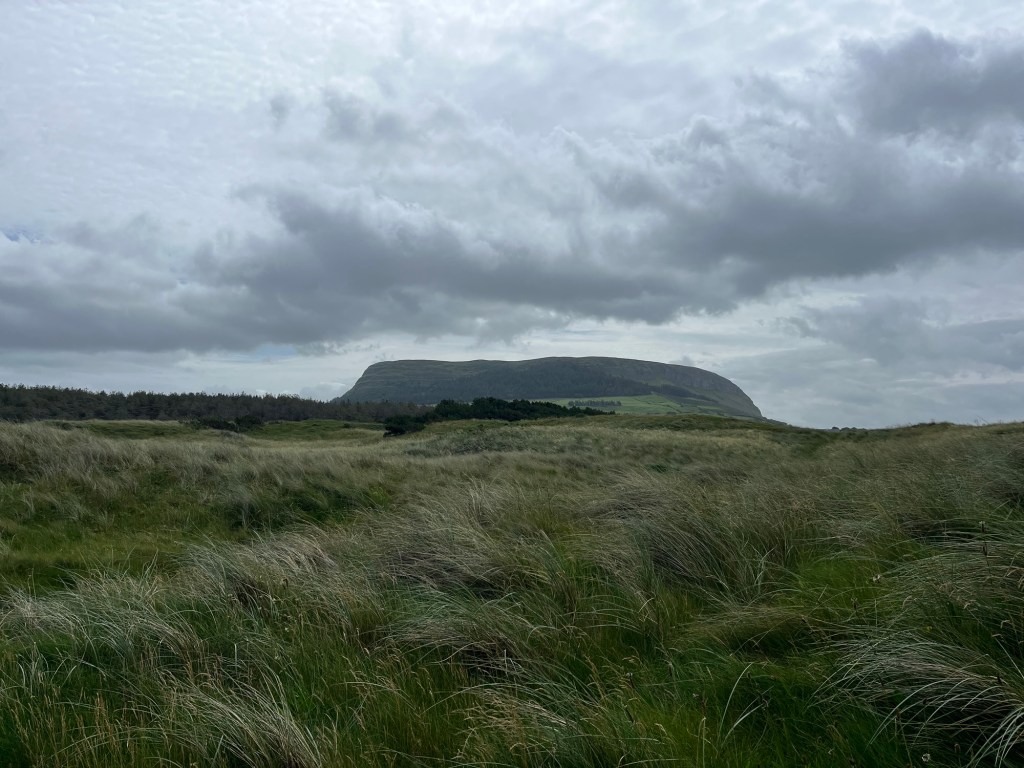 We drove toward the coast and stopped at the Strandhill flats to watch families play on the wet sand chasing the receding tide. It was a beautiful setting of sea, sand, and sky. But I wanted to hike up Knocknarea in search of the legendary Queen Maeve’s tomb. So we left and headed to the trail head parking. It was closed for a 5k run. And many of the roads were closed so we couldn’t easily turn around.