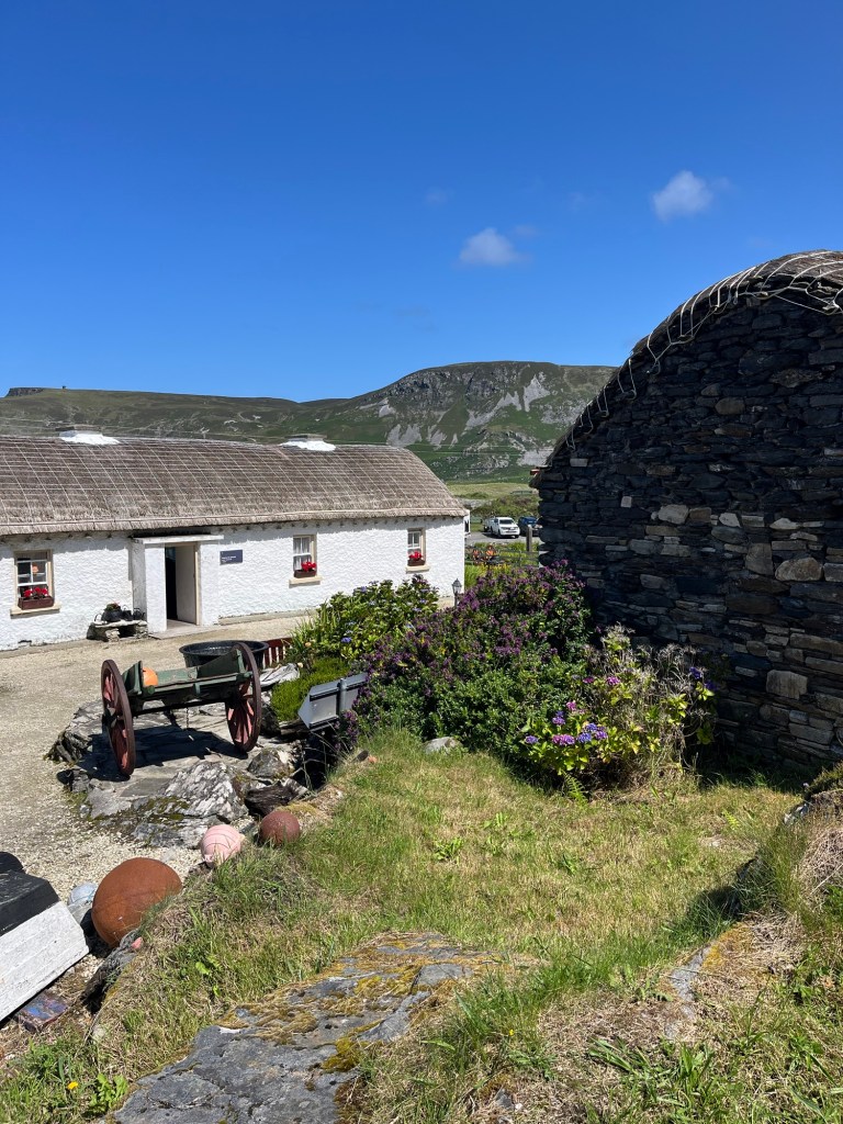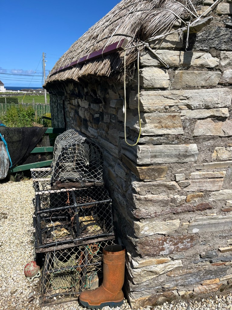 We visited Gleann Cholm Cille village. It was in a lovely location near a beautiful beach. The restored cottages were interesting. Maybe it was the dozens of unrestrained children on summer camp outings running in and out. Maybe it was the dirty and dusty interiors that looked as if no one had been in the space in a very long time. Perhaps it was the jumble and piles of artifacts lying without order in each space. I found it interesting but I have certainly been in better cared for living history locations.