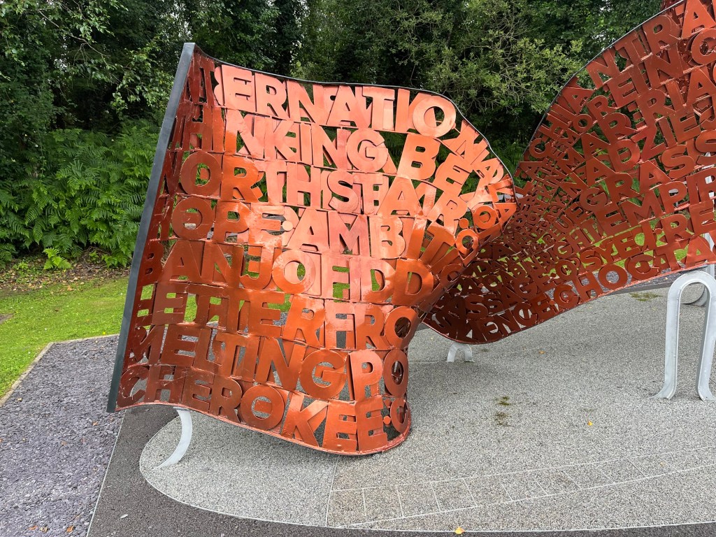 Today I stand in the parking lot of the Ulster American Folk Park in Omagh, Northern Ireland. The first thing I see is a bronze sculpture linking the Scots Irish community that immigrated from here to the Cherokee. I am intrigued. I thought I was visiting a living history farm and now I am confronted with my heritage.