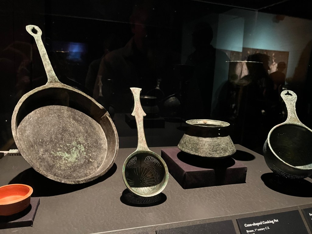 There were frescoes and statues. Everyday objects that were hard to reconcile with their actual age. How can glass that delicate be 1,000s of years old? I couldn’t wrap my head around the objects that looked so normal. Cooking tools reminded me that the tragedy of Pompeii was a story of everyday people caught off guard by nature.