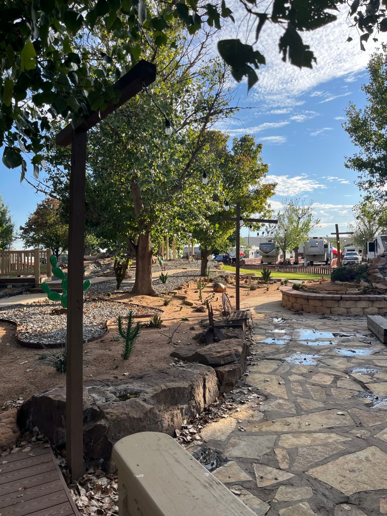 Like a caged bird, I long to fly. So I wander around the campground. I find pickleball courts, a gift shop, a laundry, a pool, and a small garden area. At least it is a garden of sorts. There is a small water feature, rocks, and cacti. Where even the cacti won’t grow there are metal plants.